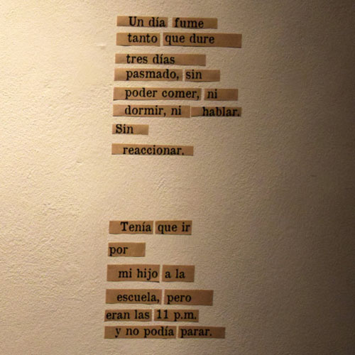 La exposición consistía en una serie de piezas que partían de una primera investigación desarrollada en la ciudad de Bogotá, en ésta, presentaba algunos aspectos que viven los adictos al crack, nombrando al ejercicio como Proyecto Bazuco. En las piezas presentadas en NoAutomático, Miguel Ángel adaptaba la terminología al contexto, de Esto fue posible gracias: Eliud Nava y Rolando Jacob (NoAutomático), Francisco Benitez, Dorney González, Aurora González (Avrora Boreal), Julián Gómez. NoAutomático. |