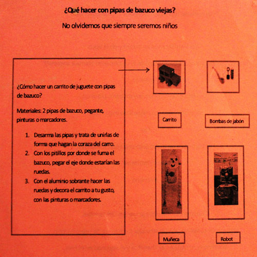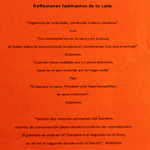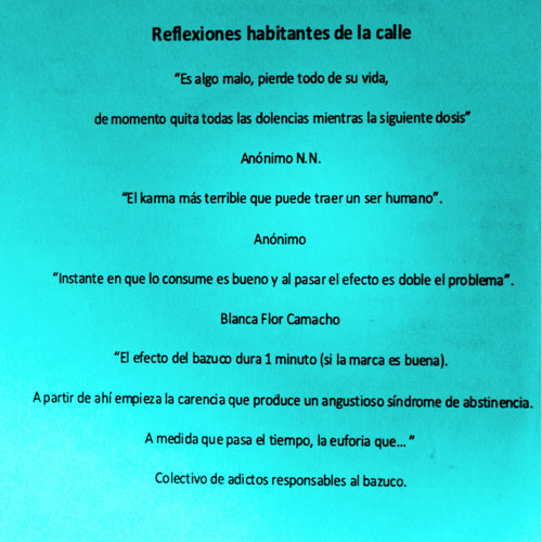 Este proyecto tiene la intención de modificar los constructos sociales que rodean el bazuco (piedra), utilizando el comercio ambulante como puente del discurso, donde el perifoneo será el detonante del ejercicio plástico. Parte de una perspectiva inverosímil, donde se proyecta en la calle una posible situación ficticia en la que quien la escucha por un momento se auto abstrae se su realidad. Por medio de un recorrido se expone un pregón sobre el bazuco y a los transeúntes se les entrega una reflexión sobre la experiencia del habitante de calle con el bazuco, además un instructivo cáustico de cómo se deconstruye una pipa de bazuco y se arma un carrito de juguete. En la Voz: Miguel Rincón Música: Amor y Control – Rubén Blades.