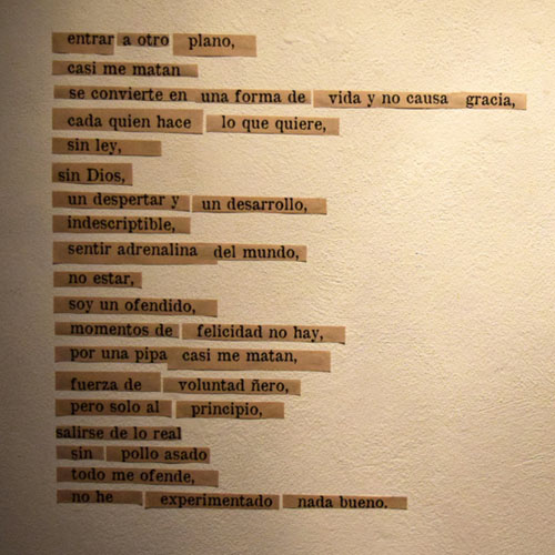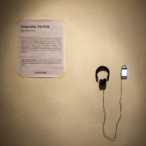La exposición consistía en una serie de piezas que partían de una primera investigación desarrollada en la ciudad de Bogotá, en ésta, presentaba algunos aspectos que viven los adictos al crack, nombrando al ejercicio como Proyecto Bazuco. En las piezas presentadas en NoAutomático, Miguel Ángel adaptaba la terminología al contexto, de Esto fue posible gracias: Eliud Nava y Rolando Jacob (NoAutomático), Francisco Benitez, Dorney González, Aurora González (Avrora Boreal), Julián Gómez. NoAutomático. |